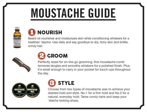 Styling your moustache is a personal choice, and the Mod Cabin's Moustache Kit provides you with all the tools you need to achieve your desired look. To begin, use the Moustache Comb to untangle any knots and smooth whiskers. Next, choose your wax based on your mood - feeling rebellious and need a sturdy hold? Go for the No. 1. Feeling low-key and just need to keep your whiskers out of your mouth? The No. 2 is your wingman. Warm up a small amount of wax between your fingers, and apply it to your moustache, working from the center outwards. Make sure to work it thoroughly through the hairs. To create a handlebar style, use your fingers or a moustache comb to shape the ends of your moustache into the desired curl or twist. (Read more about mastering your moustache here.)